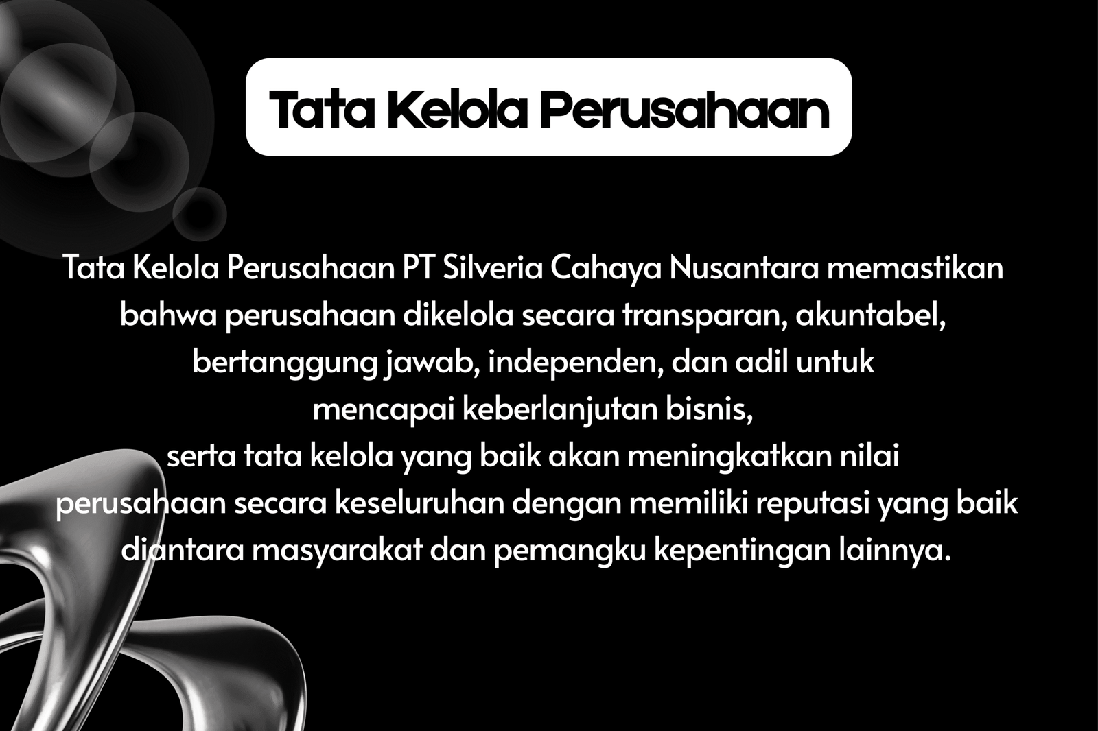 Tata Kelola Perusahaan PT Silveria Cahaya Nusantara memastikan bahwa perusahaan dikelola secara transparan, akuntabel, bertanggung jawab, independen, dan adil untuk mencapai keberlanjutan bisnis, serta tata kelola yang baik akan meningkatkan nilai perusahaan secara keseluruhan dengan memiliki reputasi yang baik diantara masyarakat dan pemangku kepentingan lainnya.